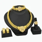 Indulge in luxury with this exquisite Dubai Gold Necklace Set, perfect for wedding parties. With its opulent design and superior craftsmanship, this set features a necklace, bracelet, earrings, and ring. Make a lasting impression and elevate your style with this luxurious jewelry set.”