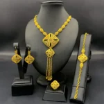 Indulge in luxury with this exquisite Necklace Set, perfect for wedding parties. With its opulent design and superior craftsmanship, this set features a necklace, bracelet, earrings, and ring. Make a lasting impression and elevate your style with this luxurious jewelry set.”