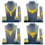 Indulge in luxury with this exquisite Dubai Gold Necklace Set, perfect for wedding parties. With its opulent design and superior craftsmanship, this set features a necklace, bracelet, earrings, and ring. Make a lasting impression and elevate your style with this luxurious jewelry set.”