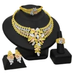 Indulge in luxury with this exquisite Necklace Set, perfect for wedding parties. With its opulent design and superior craftsmanship, this set features a necklace, bracelet, earrings, and ring. Make a lasting impression and elevate your style with this luxurious jewelry set.”